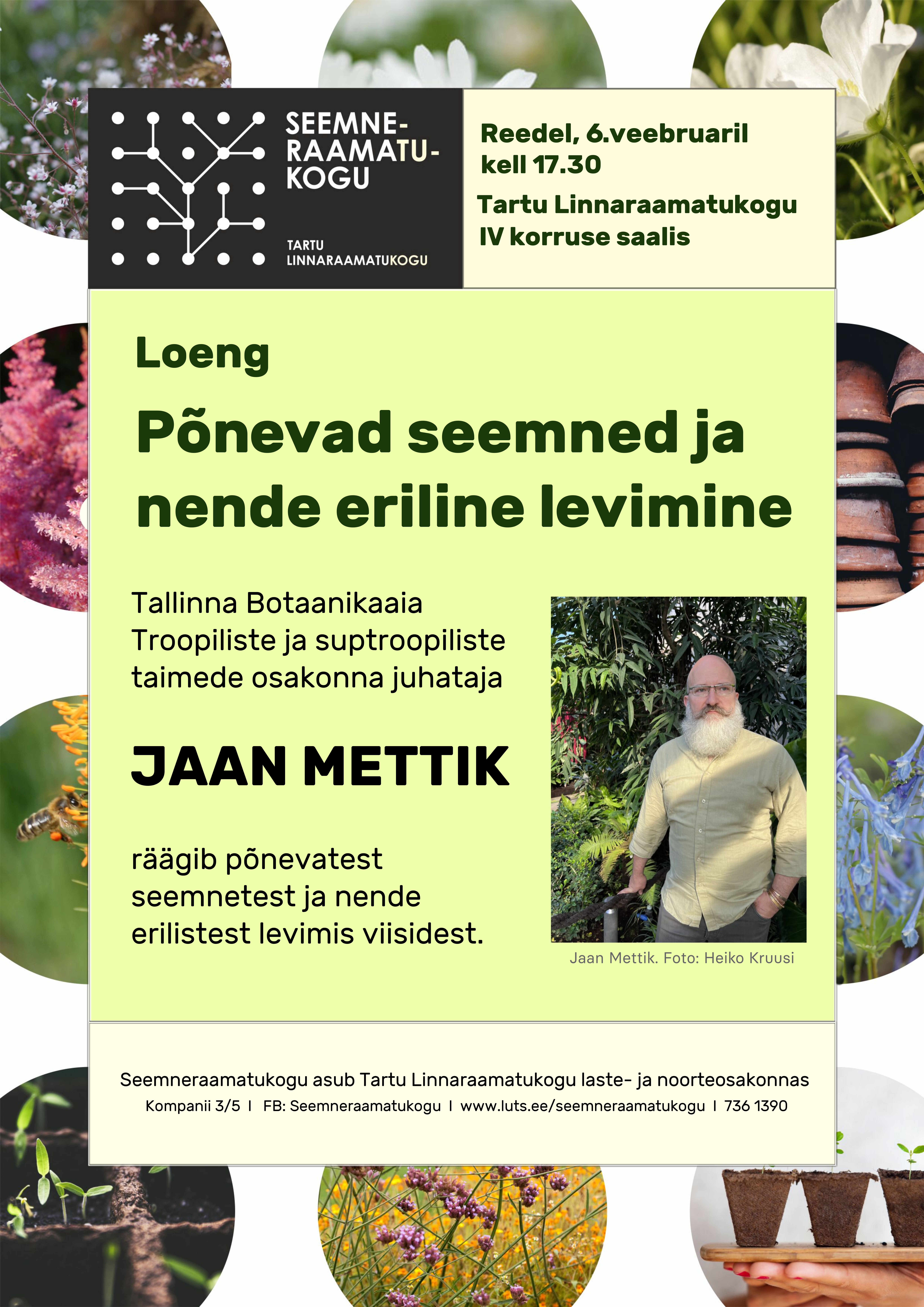 Reedel, 6.veebruaril kell 17.30 Tartu Linnaraamatukogu IV korruse saalis (Kompanii 3/5). Tallinna Botaanikaaia Troopiliste ja suptroopiliste taimede osakonna juhataja JAAN METTIK räägib põnevatest seemnetest ja nende erilistest levimisviisidest.